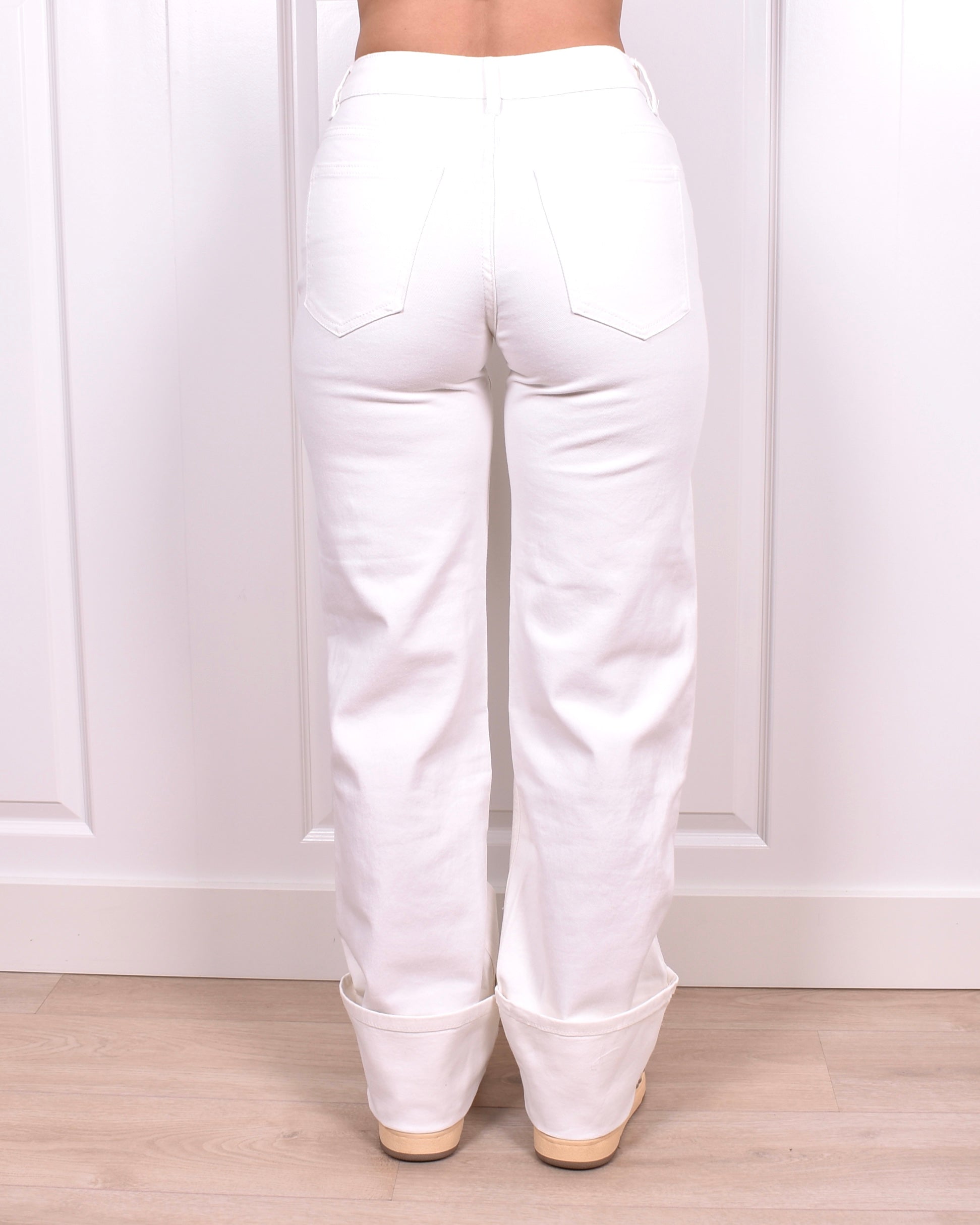 - de jeans zit omgevouwen en vast gestikt